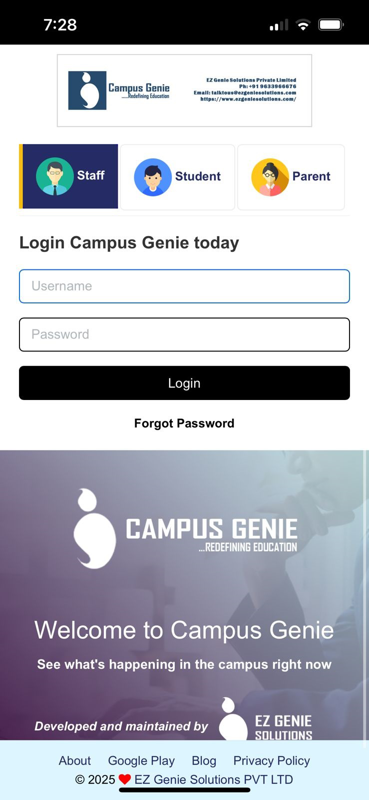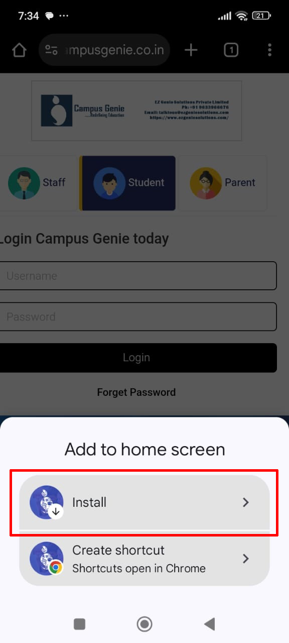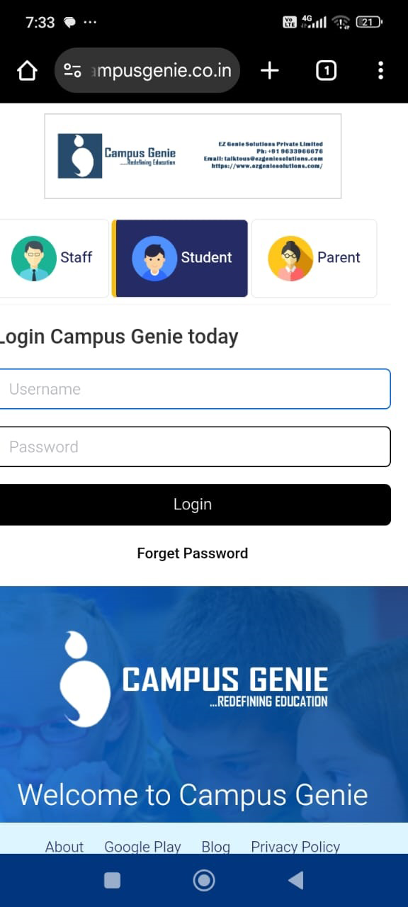 Chrome browser on your mobile and type your campus url (https://demo-college.campusgenie.co.in) in the search bar