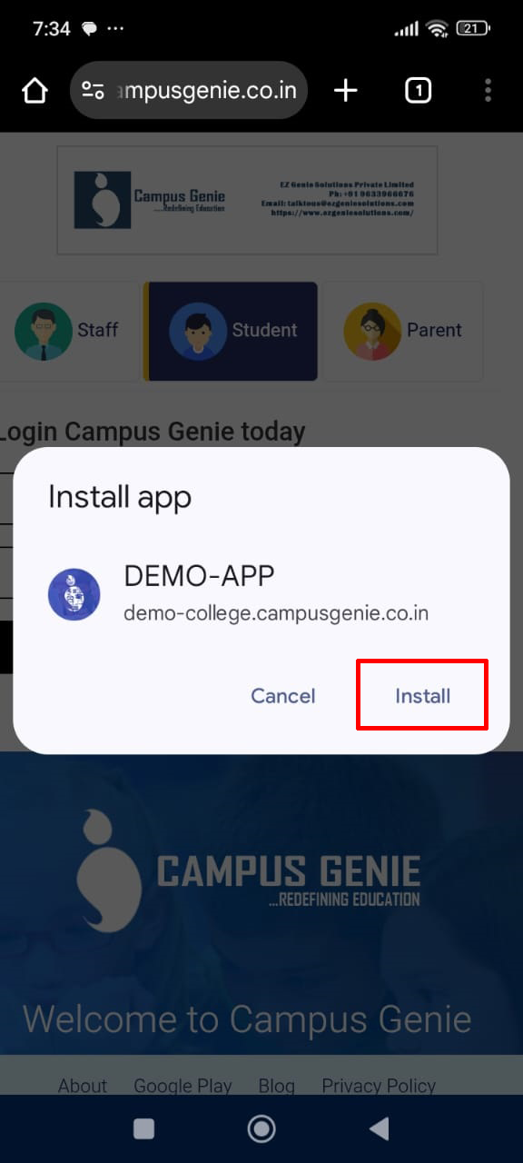 Click on the icon right side of search bar to install Campus Genie on your device
