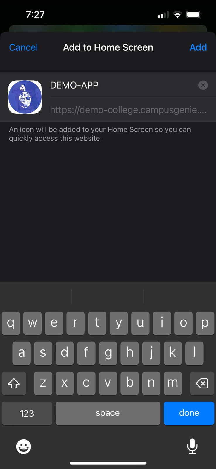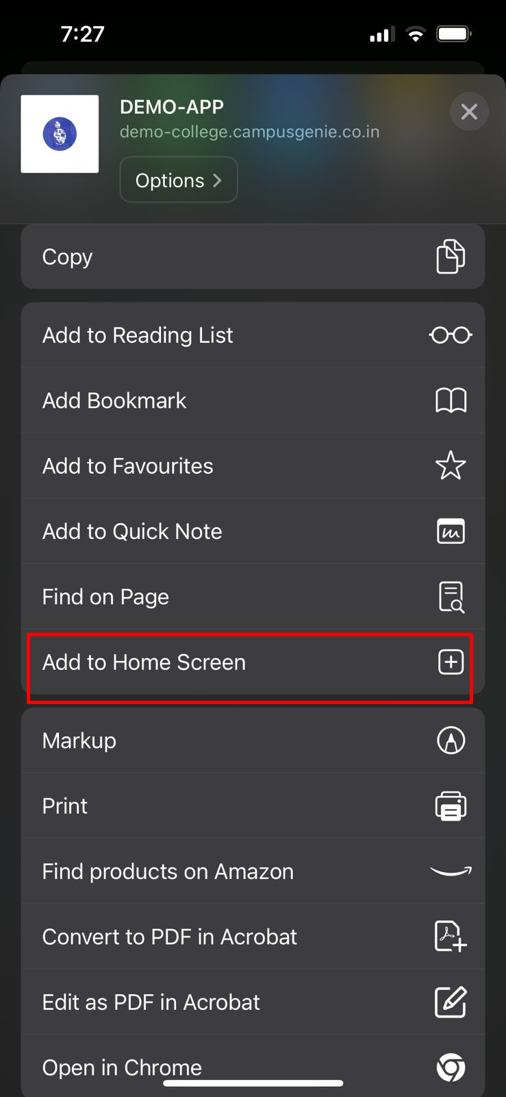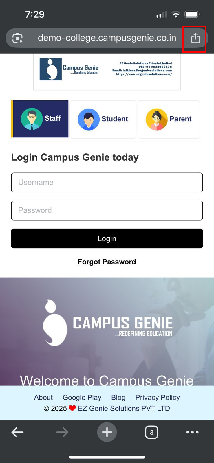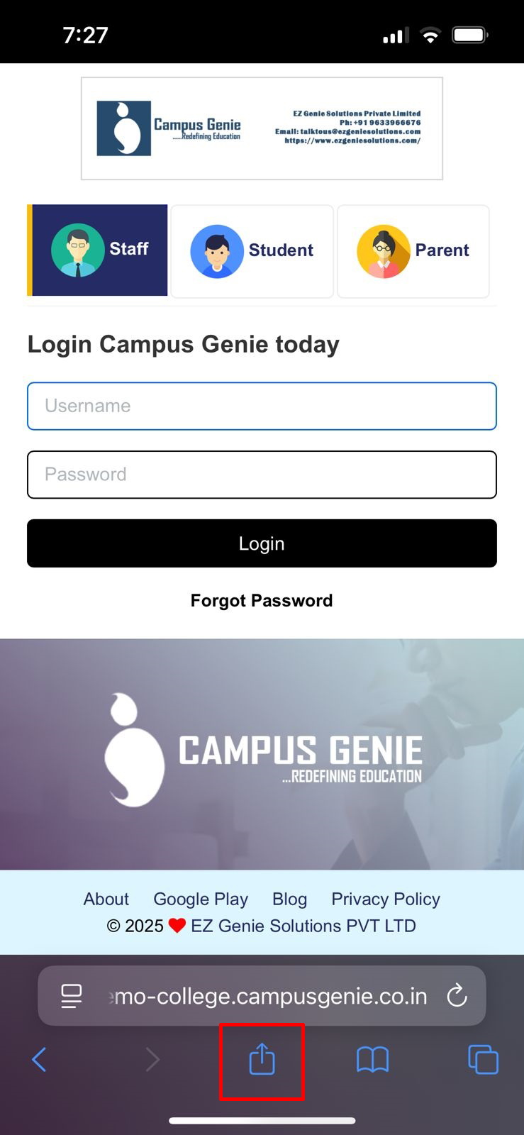 Safari browser on your mobile and type your campus url (https://demo-college.campusgenie.co.in) in the search bar, and click on the share icon